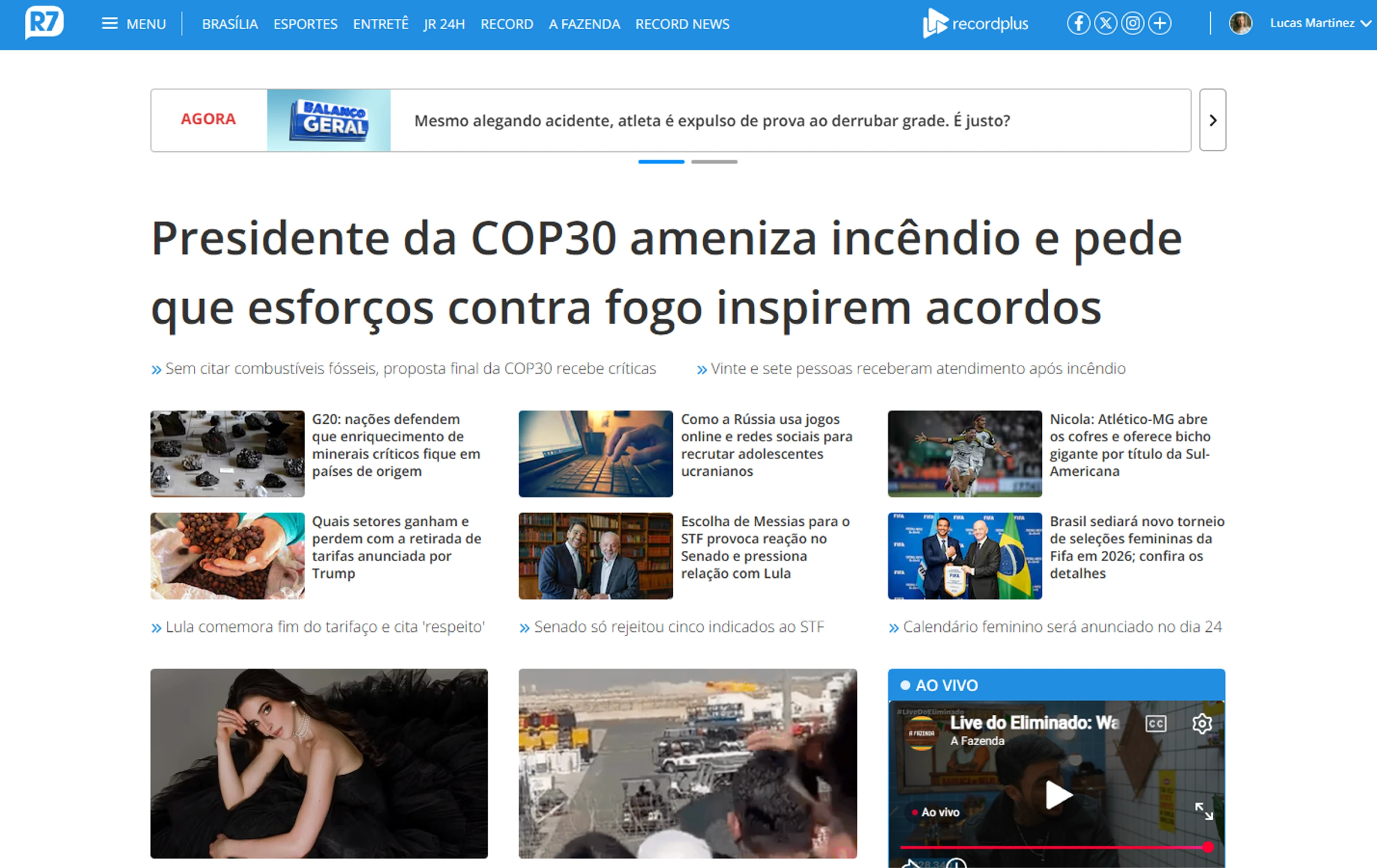 day. The platform covers a wide range of topics, including national and international politics, economy, sports, entertainment, lifestyle, technology, real-time elections updates, among many other subjects. It also features dedicated sections for every program aired by Record (the country’s second-largest television network), such as soap operas, reality shows, live news, and special events. With its dynamic content and multimedia presence, R7.com plays a key role in how Brazilians stay informed and engaged with what’s happening in the world.