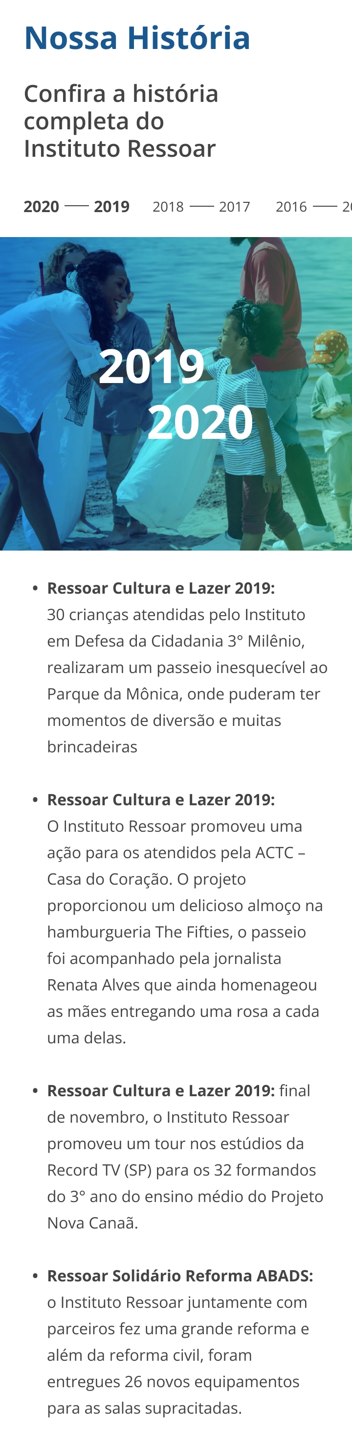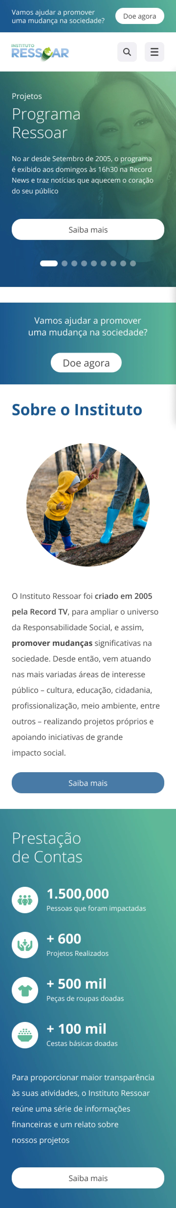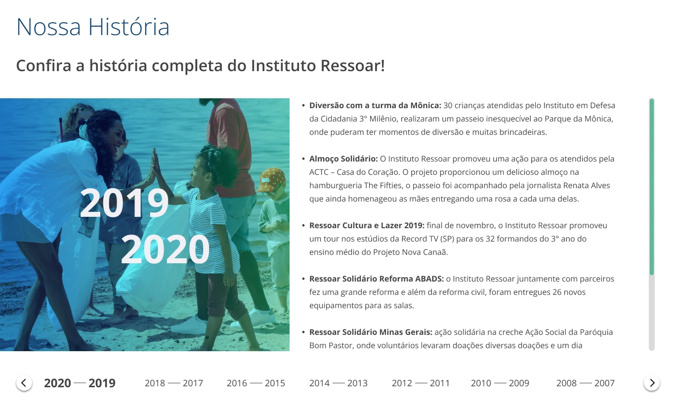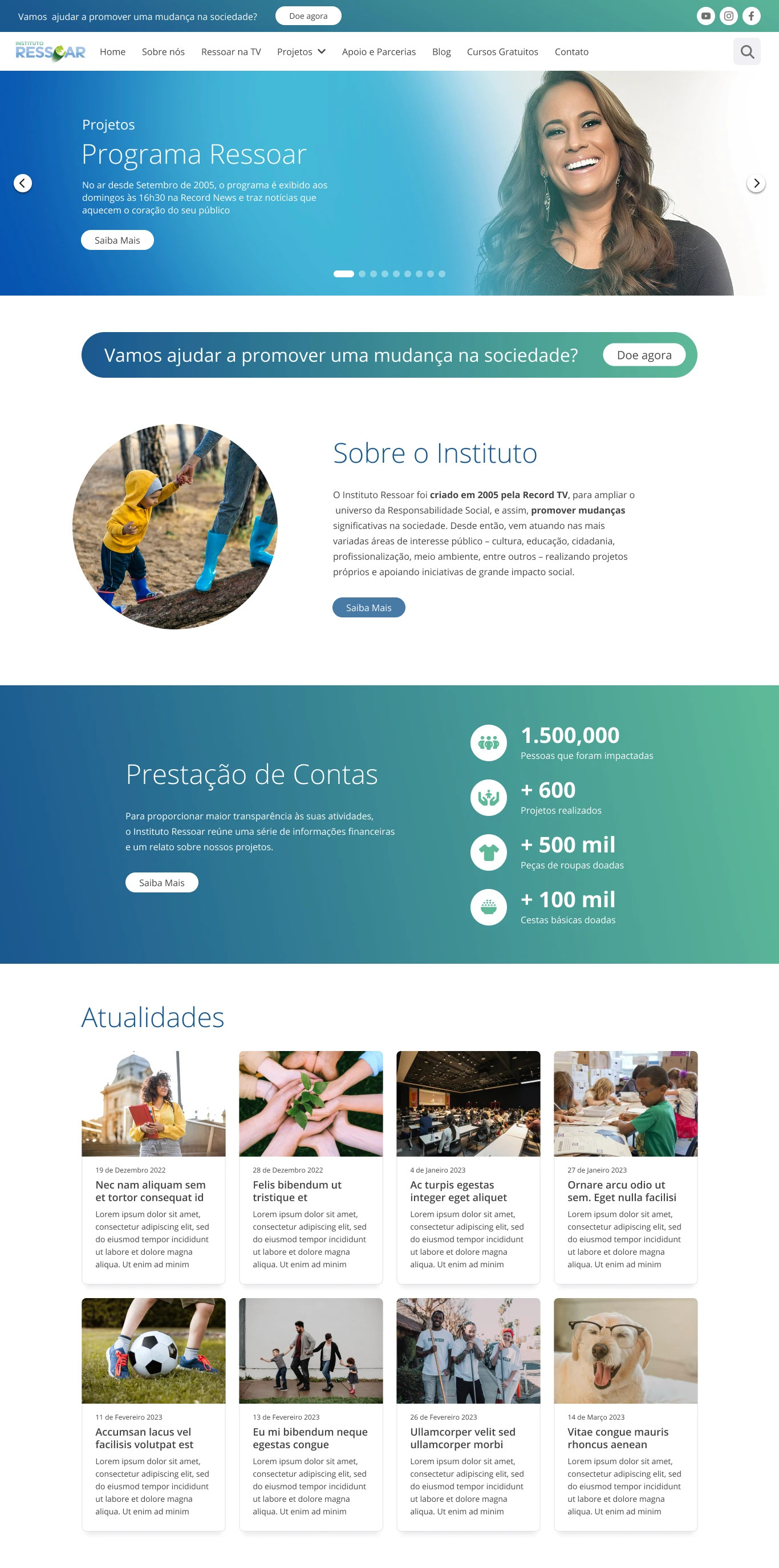The Ressoar Institute is a non-governmental social responsibility organization created by the Record group to work in culture, education, citizenship, and professional development, promoting projects that connect volunteer work, inclusion, and opportunities for communities in various regions of Brazil. The website is accessed not only by the beneficiaries of the project, but also by companies and investors interested in participating in the programs through donations, incentives, and sponsorships.