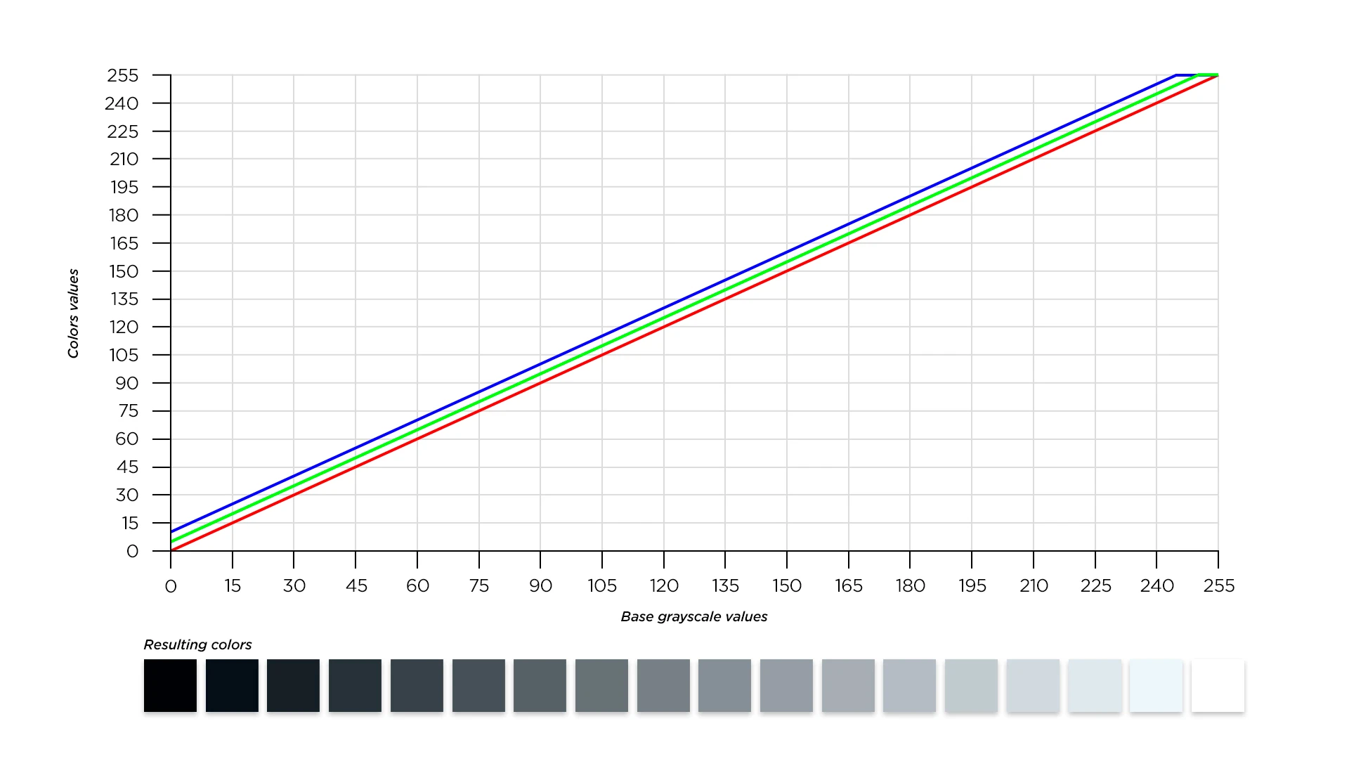 Through benchmarking, it was understood that most colors used in dark mode designs are always very close to black, forming a dark grayscale between them and the white highlights. The grayscale — including black and white — in digital media is formed by equal intensities of red, green, and blue; however, when used without proper analysis, it can create a very raw and unpleasant appearance. This graph was made to understand how a slight addition to the green and blue components of each grayscale shade would result in a slightly tinted color, aiming to avoid the aforementioned problem.
