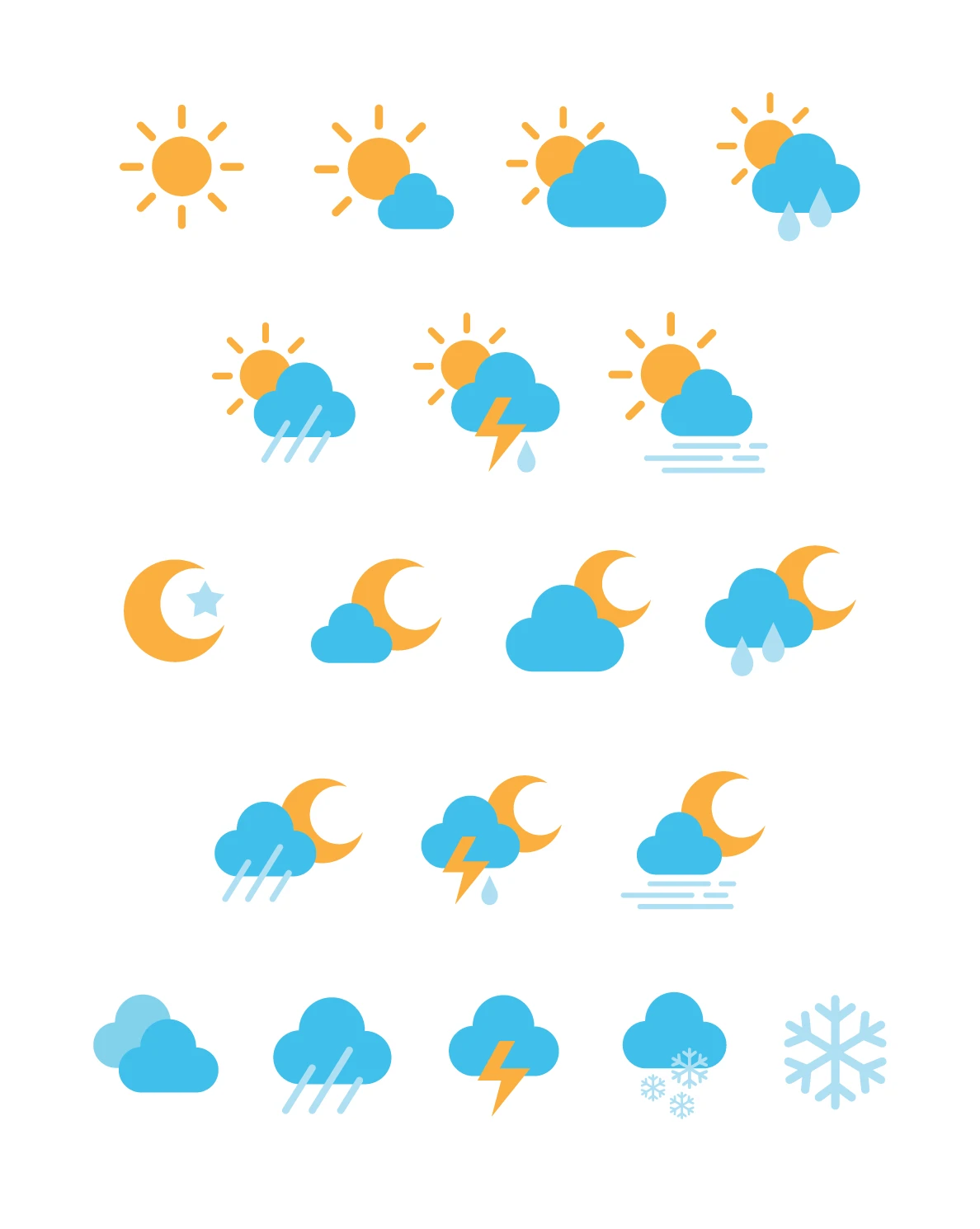 These icons represent all possible weather conditions. Their flat, minimalist design aligns with the R7 Design System, resulting in a clean and efficient visual language.