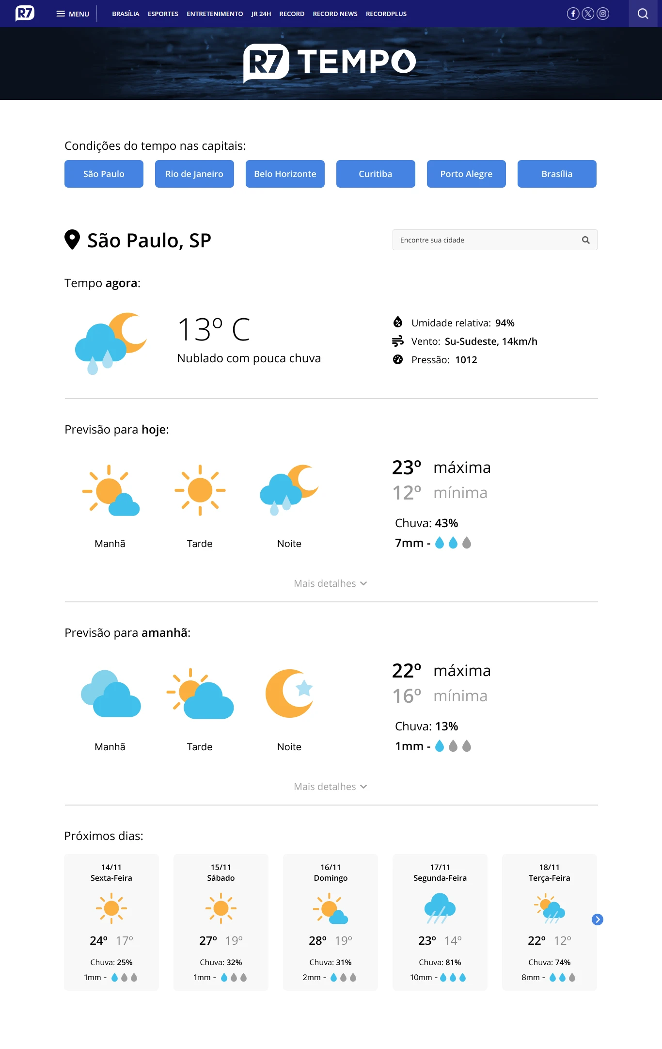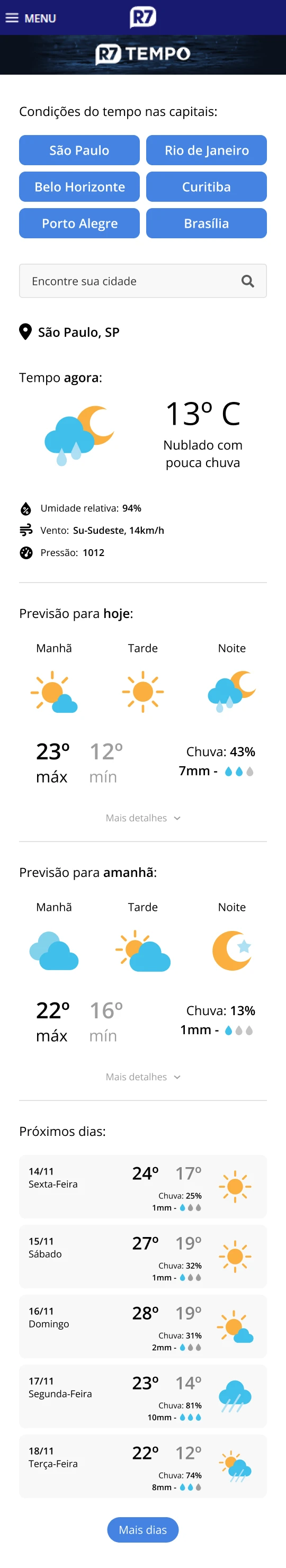 R7 Tempo is a weather forecast website, which makes it one of the most unique products within the R7 ecosystem. It helps thousands of people every day with their commutes and planning, offering accurate information quickly, clearly, and simply.