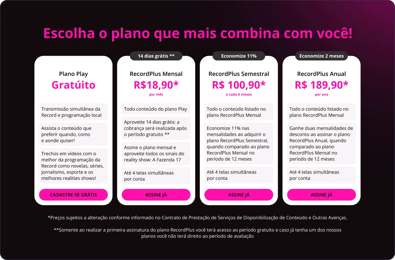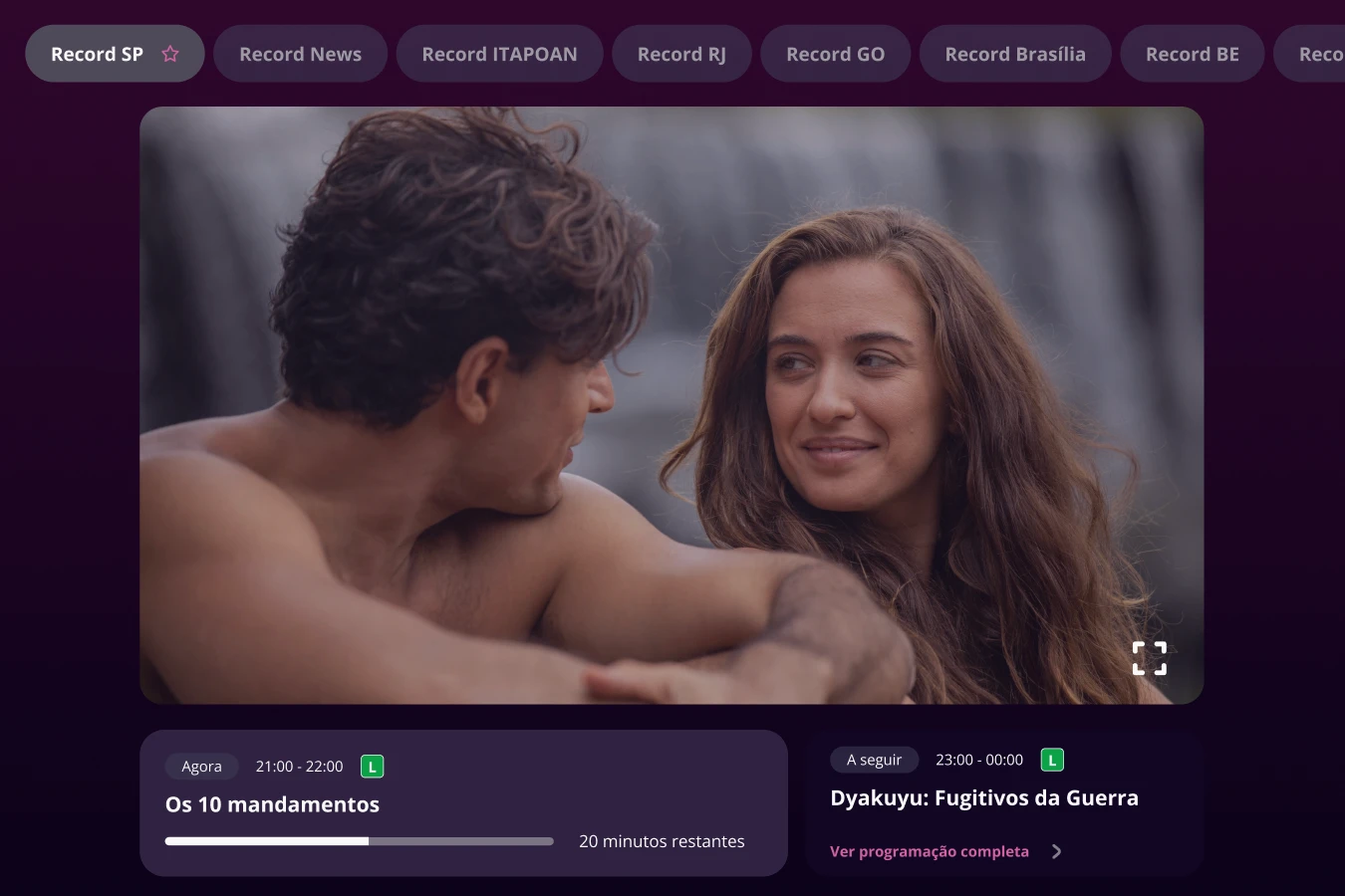 The platform offers live broadcasts and on-demand content from Record TV, including news, reality shows, live sports, and exclusive productions. It also features religious soap operas, a format uniquely produced by Record TV, attracting a large and loyal audience.
