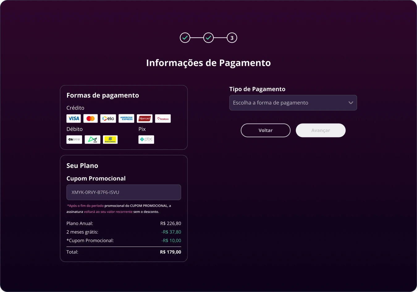 • Onboarding & Payment Setup: Users proceed with account creation and payment setup in a single step, providing all required information for subscription.