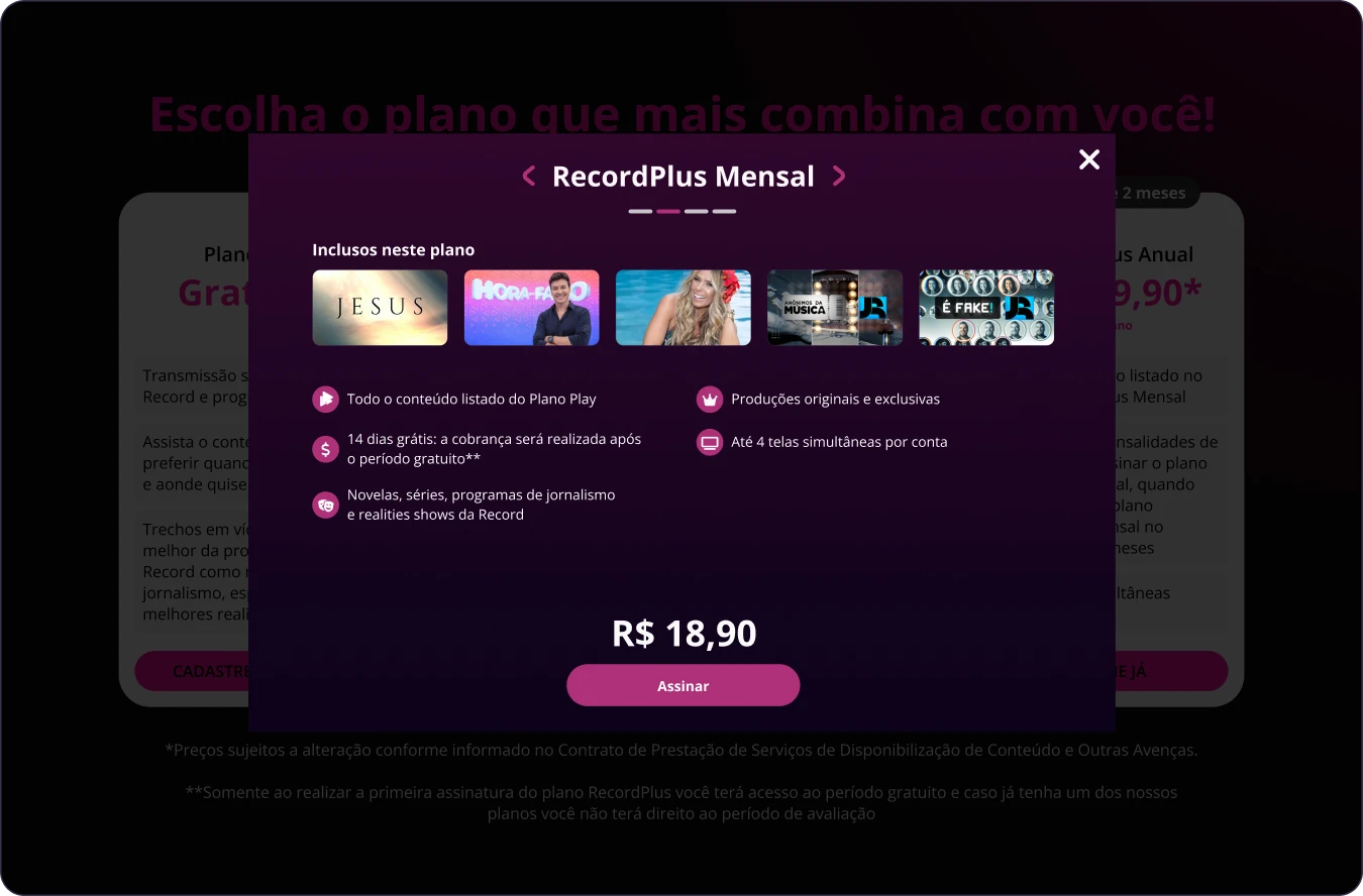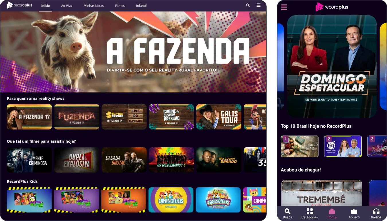 RecordPlus is the streaming platform of Record TV, Brazil’s second largest TV network. It is available on desktop, mobile, and smart TVs, with over 13 million downloads.