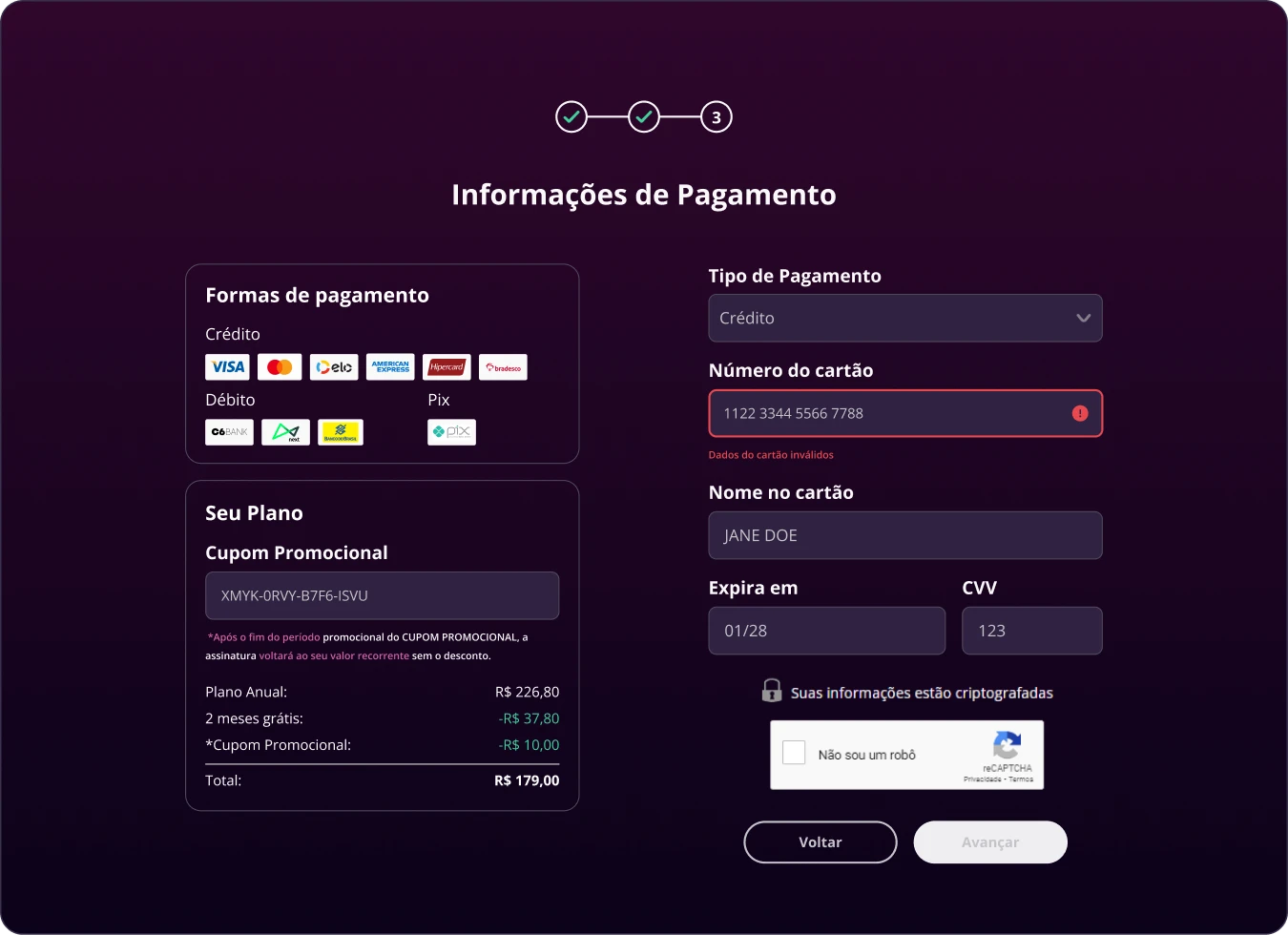 The flow includes real-time validation, clear field-level error messages, and specific guidance for resolving issues such as invalid card details, expired cards, and declined payments. Instead of generic errors, messages were designed to be precise and actionable, allowing users to quickly understand the issue and recover without restarting the process.