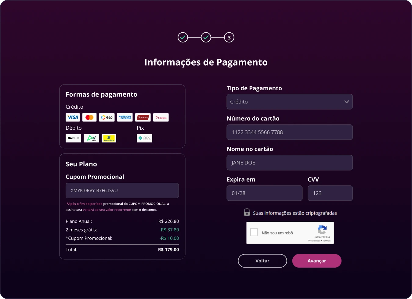 • Checkout Overview: Users can review accepted payment methods, including credit card (highlighted in this flow) and Pix. Pix is an instant payment method in Brazil where a QR code is generated for payment via a banking app.